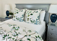 Chinoiserie-inspired and elegantly tailored, this bedding echoes the refined beauty of our Heron Botanical Mural with soft, tonal florals and trailing vines. Slightly oversized for a fuller drape and luxurious feel, it brings serene sophistication to any space—whether paired with the mural or styled on its own.