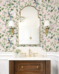Lush and romantic, this Chinoiserie Bird Vine peel and stick wallpaper features graceful birds, heirloom florals, and climbing vines inspired by classic garden Chinoiserie.